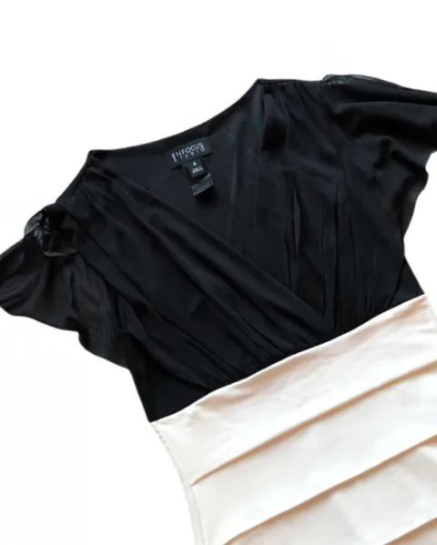 Vestido Enfocus Studio. Vestido blanco un negro súper fashion con segmentos en la parte blanca que realzan la figura, los hombros con lindos detalles de transparencia. Te encantará!!