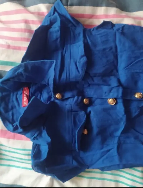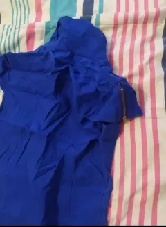 Vestido azul marino de licra amoldable al cuerpo tiene bonotes en el frente para cerrar el vestido y unos cierres en la parte de los hombros que puede agrandar un poco la prenda, posee 2 bolsas en la parte de enfrente y 2 en la parte de atrás, la talla es chica y tiene un largo de 74cm