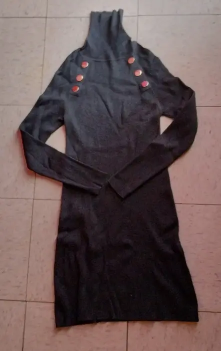 Vestido entallado con cuello. Vestido entallado con cuello altoColor gris oscuroTalla MedianaMarca Zara Detalles de botones doradosLa tela es gruesa, es temporada otoño inviernoSe amolda a tu cuerpo La prenda se manda previamente lavada.