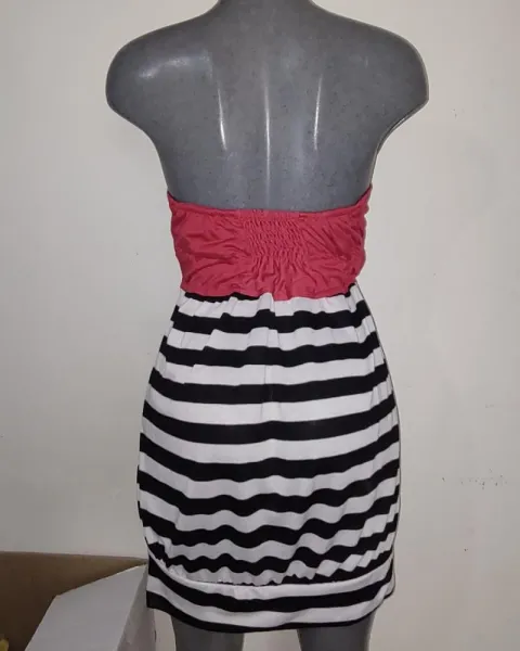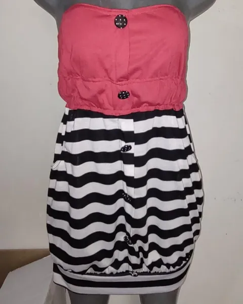 Vestido sin tirantes.Color rojo blanco y negroBotonesMini vestido
