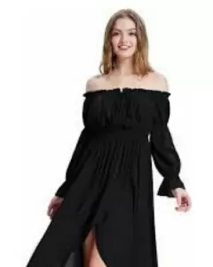 Vestido escote en hombros. Vestido largo con mangas, hombros caídos y una abertura en entre pierna súper moderno usado una vez