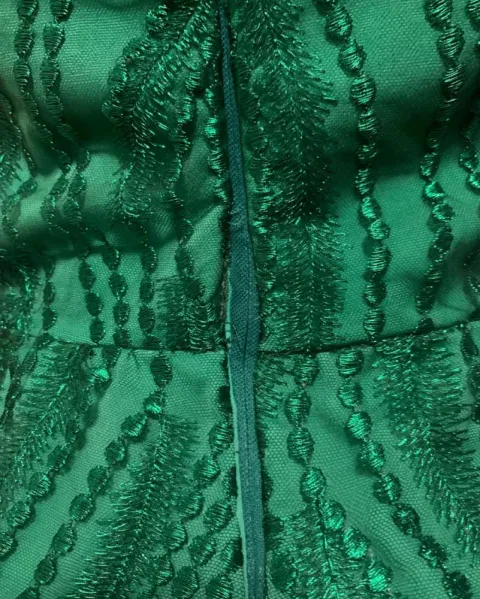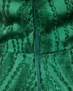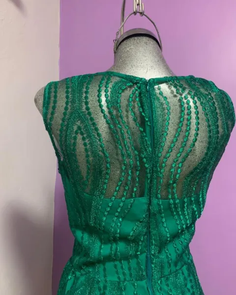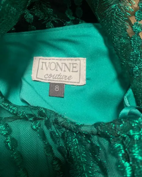 Precioso vestido color verde esmeralda, con detalles en hilo metálico. Es de la marca IVONNE talla 8, da a una mediana o grande. Las medidas son: 43 cm axila a axila, 85 cm de largo y 74 cm de cintura.