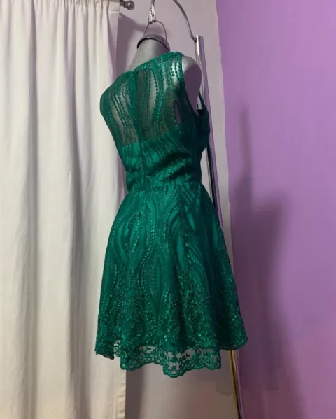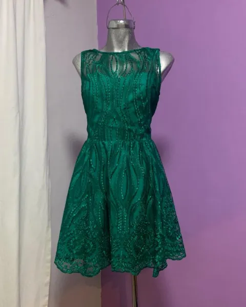 Vestido esmeralda corto. Precioso vestido color verde esmeralda, con detalles en hilo metálico. Es de la marca IVONNE talla 8, da a una mediana o grande. Las medidas son: 43 cm axila a axila, 85 cm de largo y 74 cm de cintura.