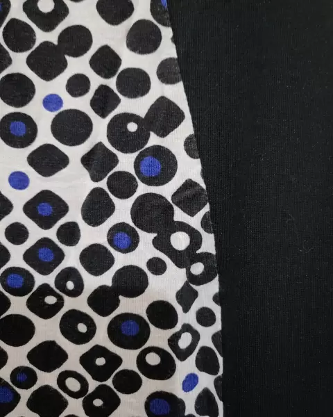 Vestido estampado en la.parte central por ambos lados en colores negro, blanco y azul, en los costados es negro, por lo que acentua la figura, tiene forro, va ajustado al.cuerpo, con mangas en 3/4, llega a las rodillas, talla 2