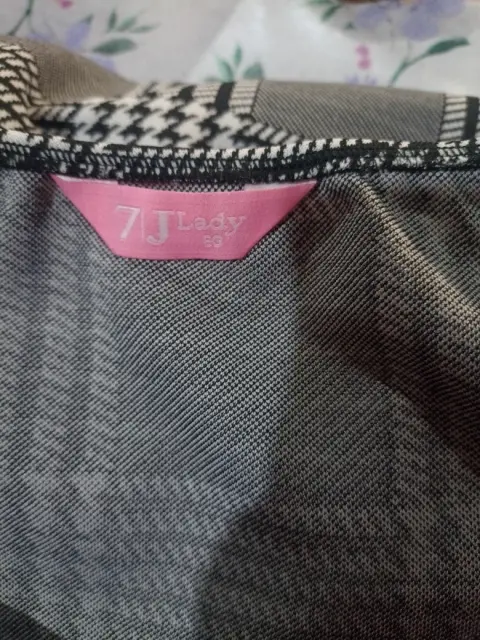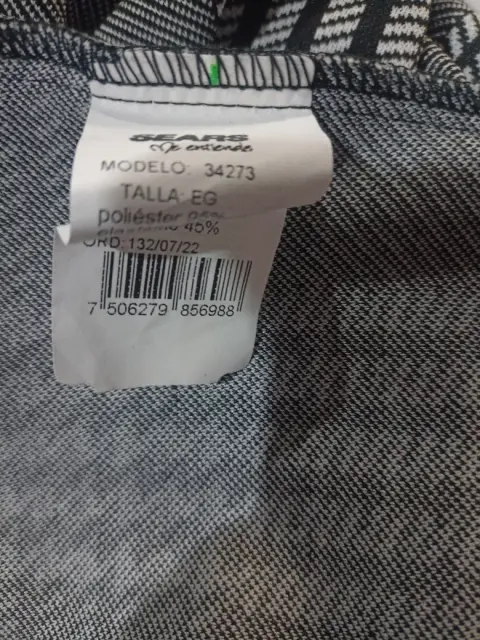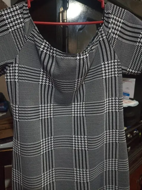 Vestido estampado. Vestido color gris con estampado de cuadros, largo a la rodilla, manga corta y jareta en frente