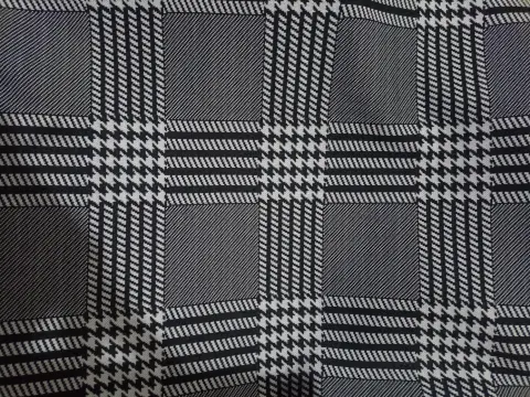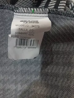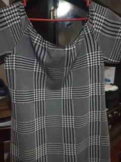Vestido color gris con estampado de cuadros, largo a la rodilla, manga corta y jareta en frente