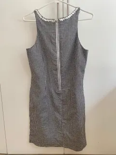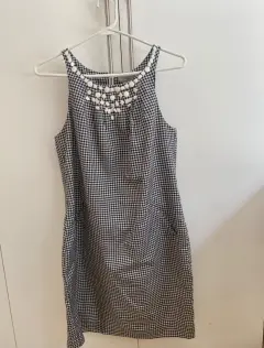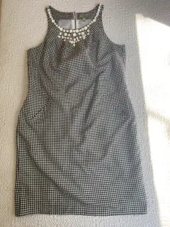Vestido fresco sin manga con bordado de bisutería en cuello. Estampado en mascota blanco y negro, mide 85 cm de largo, 44 de busto y 49 de cadera.Talla 8.