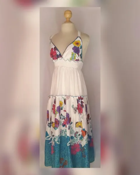 Vestido Estampado estilo Empire. Vestido ligero estilo empire tono BLANCO POLAR c/estampado floral MULTICOLOR, escote tirantes en halter, elástico bajo el busto p/mejor ajuste y fondo ligero interior. UNITALLA (da a M/L). Dimensiones cms: 39 axila, 34 cintura (da hasta 52), 123 ruedo, 27 largo torso, 100 largo faldon, 127 largo total. 100% algodón. P/lavado en caso.