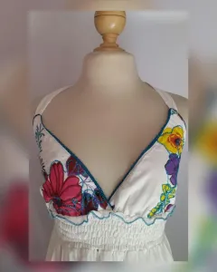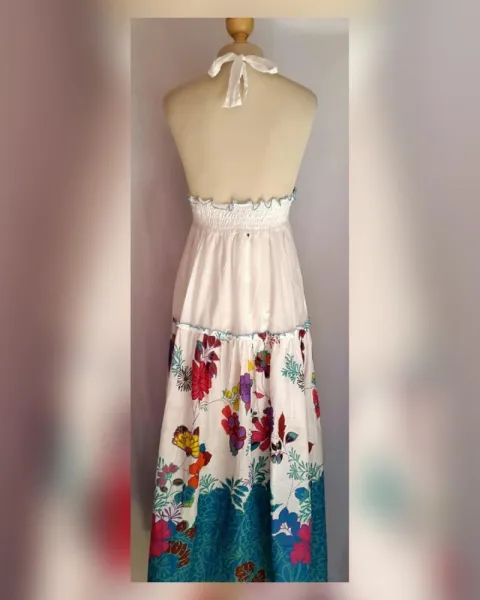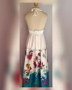 Vestido ligero estilo empire tono BLANCO POLAR c/estampado floral MULTICOLOR, escote tirantes en halter, elástico bajo el busto p/mejor ajuste y fondo ligero interior. UNITALLA (da a M/L). Dimensiones cms: 39 axila, 34 cintura (da hasta 52), 123 ruedo, 27 largo torso, 100 largo faldon, 127 largo total. 100% algodón. P/lavado en caso.