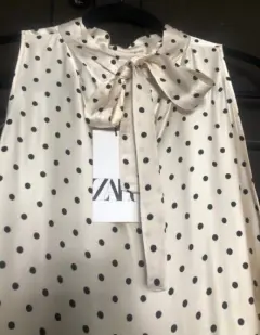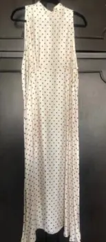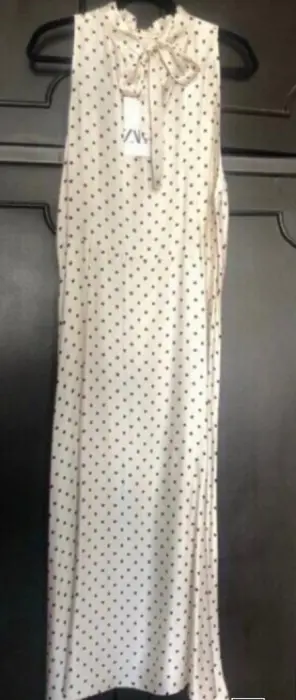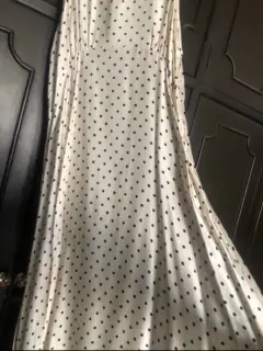 Divino vestido largo en color beige con lunares en negro, tiene cierre invisible lateral y moño en cuello por la parte de atrás, es una tela muy suave de satín, totalmente nuevo con etiqueta. Medidas: axila 56cms, cintura 52cms, cadera 57cms. Corte A