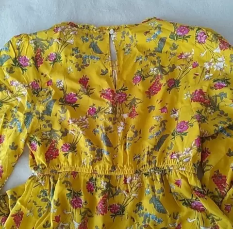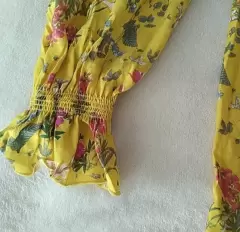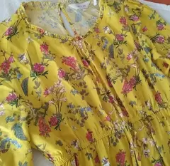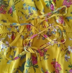 Bonito vestido color amarillo y estampado floreado 36cm de hombro a hombro 46cm de axila a axila sin estirar el resorte bajo el busto 40cm de cintura que aumenta por los pliegues