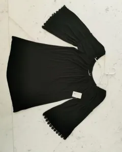 Vestido nuevo estilo campesino de tela tipo camiseta. Color negro. Corte en A. Cuello zurcido con elástico. Mangas acampanadas con zurcido y elástico arriba del codo, acabado en bordado. Talla L pero es muy amplio.