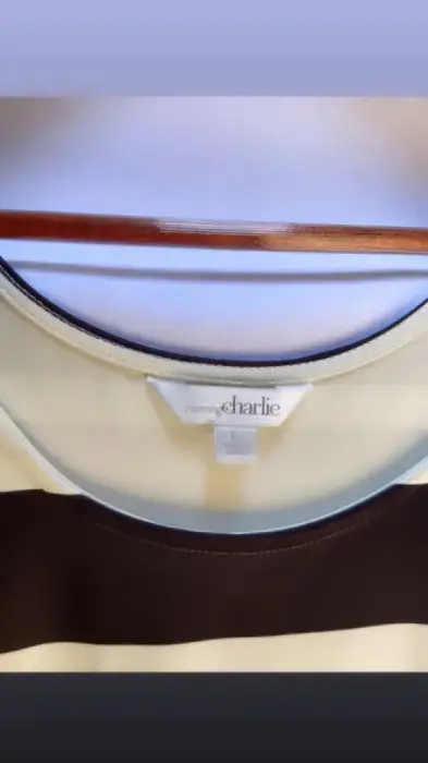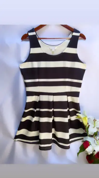 Vestido estilo jersey sin mangas con rayas blancas y negras, escote redondo. Corte en la cintura, pinzas delanteras para busto. Falda semicircular tableada. Tela dePoliéster y Spandex. Talla: L (34-36) Marca: Charming Charlie.