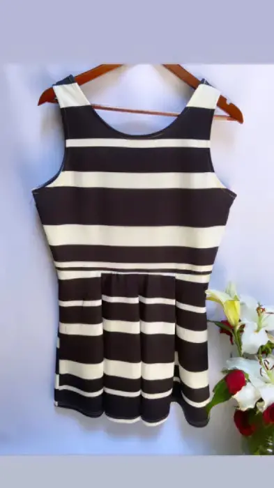 Vestido estilo jersey sin mangas con rayas. Vestido estilo jersey sin mangas con rayas blancas y negras, escote redondo. Corte en la cintura, pinzas delanteras para busto. Falda semicircular tableada. Tela dePoliéster y Spandex. Talla: L (34-36) Marca: Charming Charlie.
