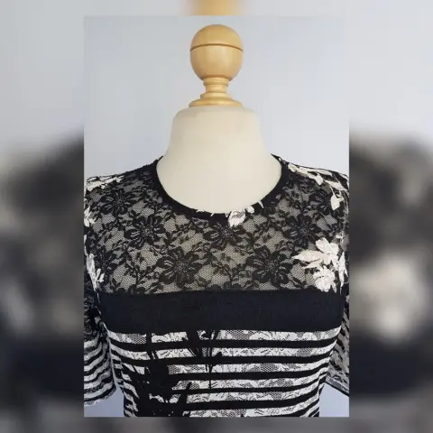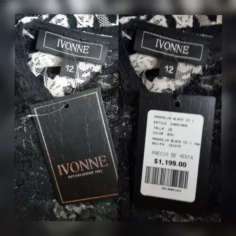 Vestido estilo Sheath estampado magnolias bitono NEGRO ÉBANO/BLANCO LINO, cuello redondo, manga corta, cierre p/cremallera trasera y botón, y forro interior. Talla 12. Dimensiones cms: 39 hombro, 46 axila, 40 cintura, 50 cadera, 49 ruedo, 93 largo, 29 largo manga. 96% poliéster, 4% elastano. P/lavado en casa.