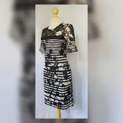 Vestido estilo Sheath estampado Magnolia. Vestido estilo Sheath estampado magnolias bitono NEGRO ÉBANO/BLANCO LINO, cuello redondo, manga corta, cierre p/cremallera trasera y botón, y forro interior. Talla 12. Dimensiones cms: 39 hombro, 46 axila, 40 cintura, 50 cadera, 49 ruedo, 93 largo, 29 largo manga. 96% poliéster, 4% elastano. P/lavado en casa.