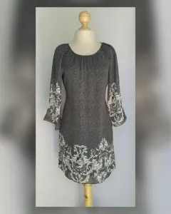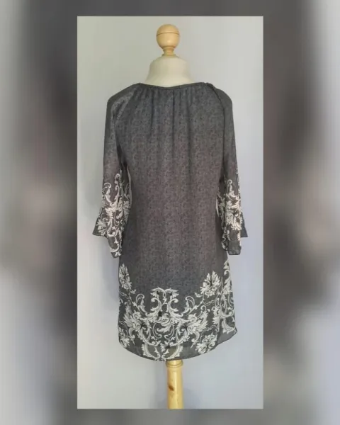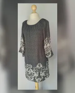 Vestido estilo túnica color GRIS LOBO DEGRADADO c/estampado Paisley tono BLANCO LINO, cuello redondo, manga 3/4 terminada en campana y abertura, cierre p/cremallera lateral y forro interior. Talla G. (REDUCIDA, da mejor a M). Dimensiones cms: 46 hombro, 52 axila, 47 cintura, 55 ruedo, 82 largo. 100% poliéster. Para lavado en casa.***NO ES STRETCH***