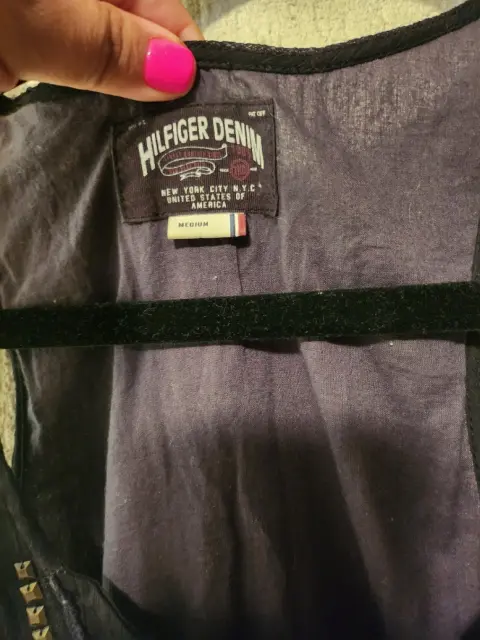 Vestido negro talla chica marca Tommy, sin mangas y estoperoles al frente, es caída en A y llega arriba de la rodilla