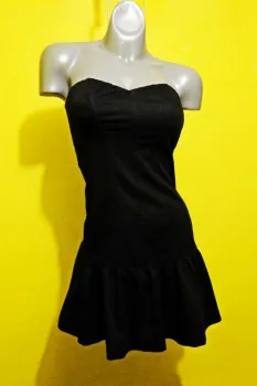 COLOR NEGRO, STRAPLESS, STRETCH 1% SPANDEX, 99% ALGODON, CIERRE A UN COSTADO, TALLA CHICA 6 EQUIVALE A UNA TALLA 28, MEDIDAS DE UNA CARA: AXILA A AXILA 36 CM (ESTIRA HASTA LOS 44 CM), CINTURA 38 CM (ESTIRA HASTA LOS 41 CM), CADERA 48 CM (ESTIRA HASTA LOS 52 CM), LARGO 68 CM.