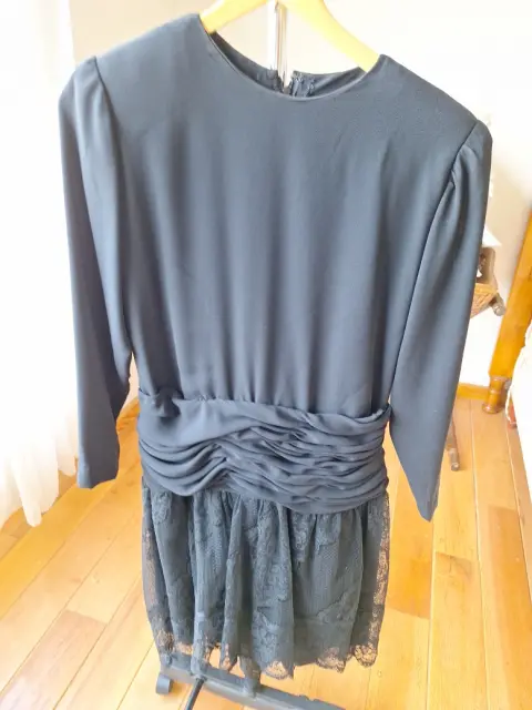 Vestido fiesta. Vestido negro hecho a medida con la cintura feuncida y la falda en capas de encaje fino, con manga larga.
