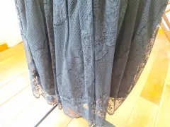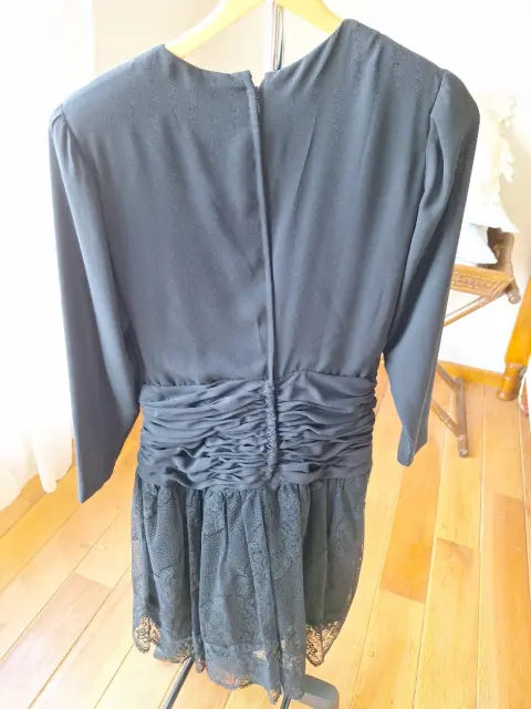 Vestido negro hecho a medida con la cintura feuncida y la falda en capas de encaje fino, con manga larga.