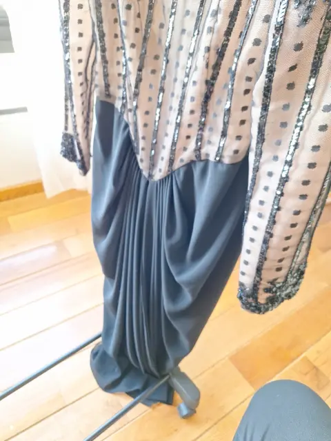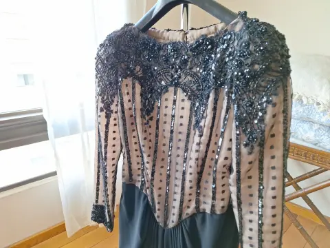 Vestido fiesta. Vestido negro de boda con cuerpo borrado y detalle en la espalda con falda a medio tobillo plisada. Mangas largas con el detalle bordado del cuerpo