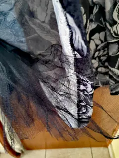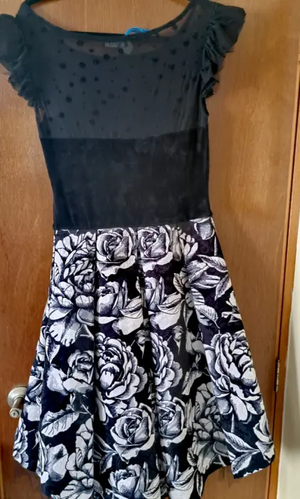 Vestido negro con flores y un poco de tul en la parte de abajo, de fiesta sin ningún detalle ,puesto solo una vez