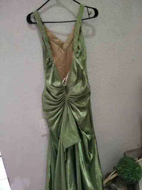 Vestido de fiesta super bonito y elegante con colá y amplio en la parte baja, con bisuteria en la parte de los tirantes por enfrente y por atrás SIN DETALLES... LE FALTA SU TINTORERÍA y queda como NUEVO