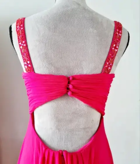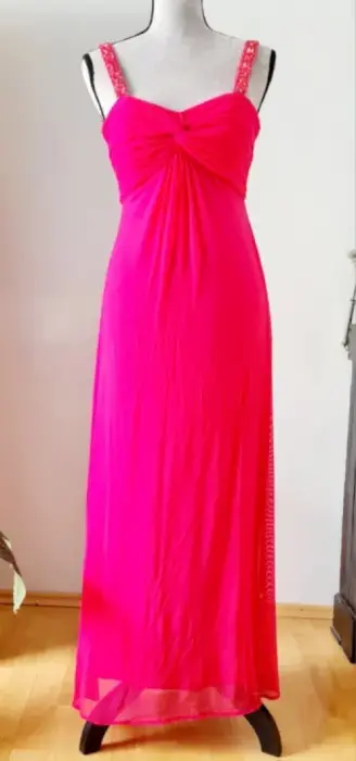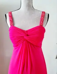 Vestido en color rosa mexicano, tirantes con pedrería, escote en la espalda baja, tiene zurcida la tela delgada se puede apreciar en la última foto, casi ni se ve, este lindo vestido tiene mucha vida y sirve para algún compromiso.Sus medidas son:Cintura: 38 cmBusto: 42 cmLargo: 135 cm