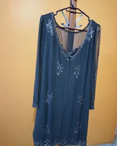 Hermoso vestido corto para fiesta, color gris, talla 8 le queda a un mediano, manga larga con aberturas en las mangas, con pedrería, da excelente figura, se puede enviar más fotos.