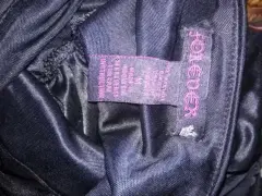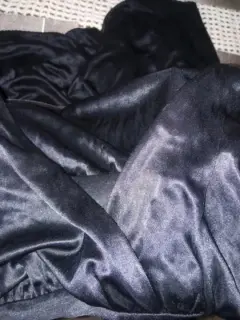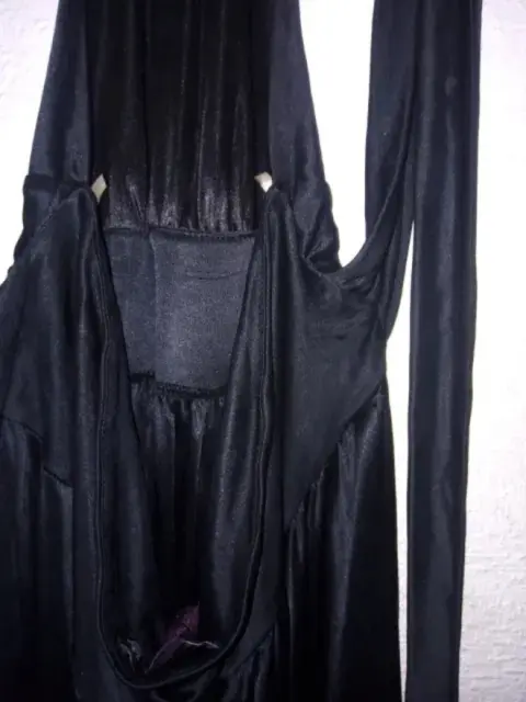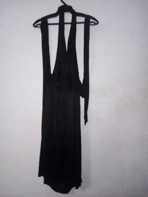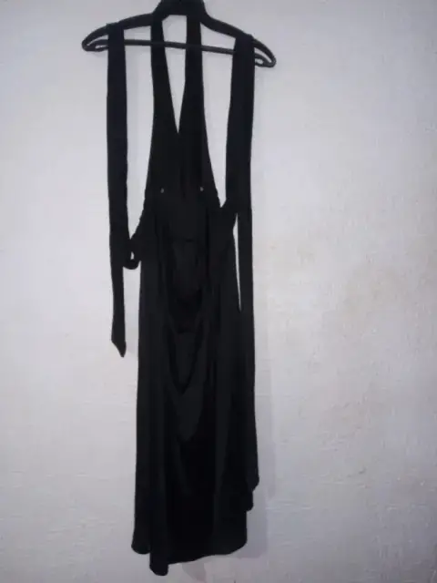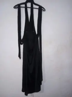 Vestido para satinado en color negro, escote en espalda y hombros. De largo 104 cm, falda 56 cm, y los cintas 122 cm de cada lado. En el cuello tiene 3 botones. De cintura 85 cm.