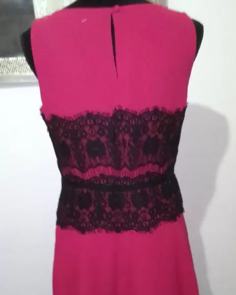 Vestido fiusha con encaje negro está nuevo con etiqueta, trae forro,tela 100%polyester.Ancho espalda 36cm., Contorno pecho 94cm.,cintura 74cm.,Largo 91cm