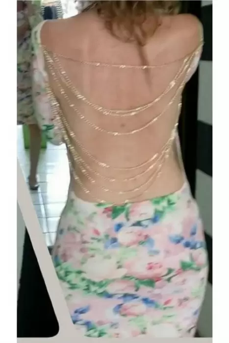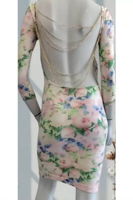 Vestido Floral,con escote y cadenas doradas en espalda, tela ajustable, Es Unitalla pero le va bien a una talla M.