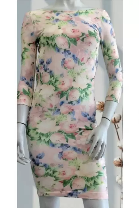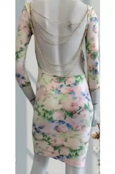 Vestido Floral CARIVAN. Vestido Floral,con escote y cadenas doradas en espalda, tela ajustable, Es Unitalla pero le va bien a una talla M.
