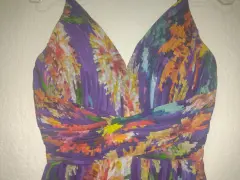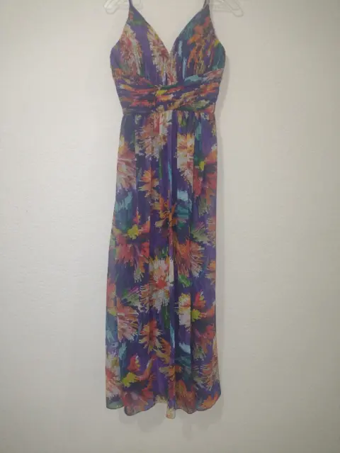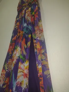 Vestido floral largo talla chica. Vestido largo, tela estampada de flores, con forro. Escote drapeado para dar volumen. Abertura en el costado izquierdo. Falda con vuelos.