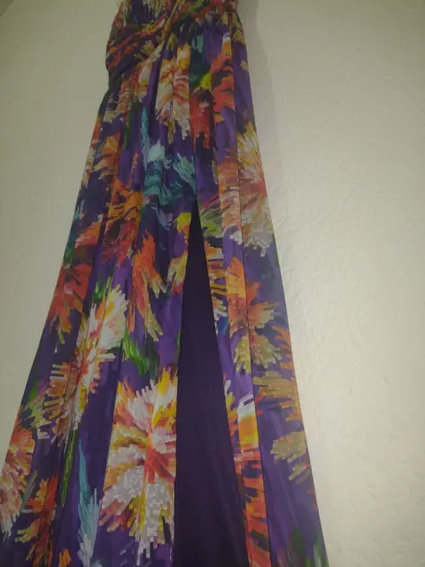 Vestido largo, tela estampada de flores, con forro. Escote drapeado para dar volumen. Abertura en el costado izquierdo. Falda con vuelos.