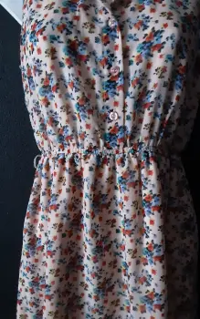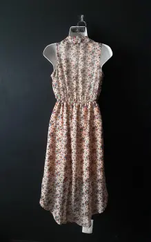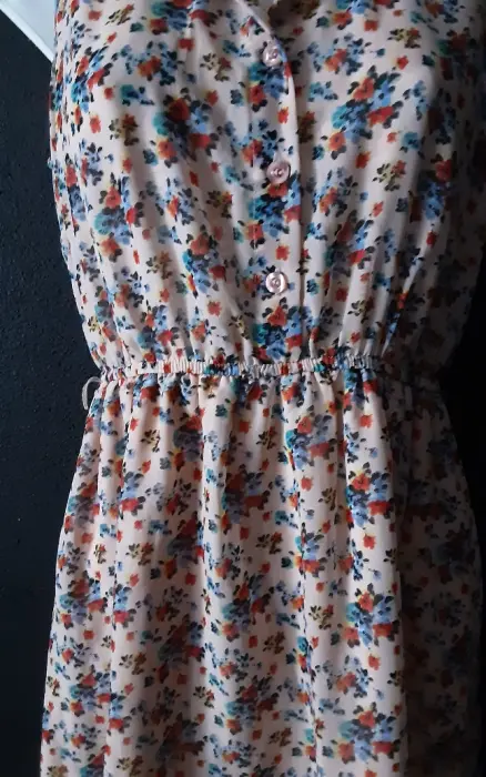 Vestido fresco floreado colá de pato con fondo a la rodilla con botones y resorte en la cintura sin mangas