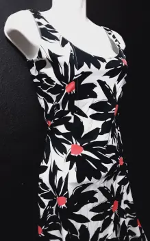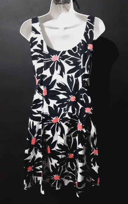 Vestido floreado. Vestido corto con diseño floreado con negro blanco y rosado escote redondo con Varillas en la parte del torso