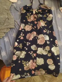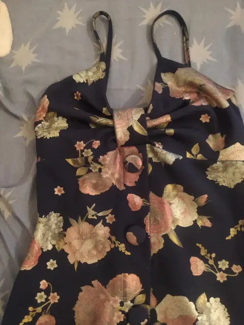 Vestido floreado. Vestido pegado color azul marino con estampado de flores, tiene botones grandes de decoración en la parte de enfrente del vestido, es de tirantes.