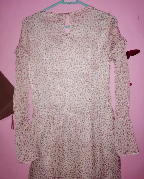 Vestido floreado. Hermoso y fresco vestido floreado en tonos rosas, pequeños y discretos tonos dorados. Hermosa Manga acampanada. Es talla extra chica pero viene amplio le va bien a una talla chica o mediana.
