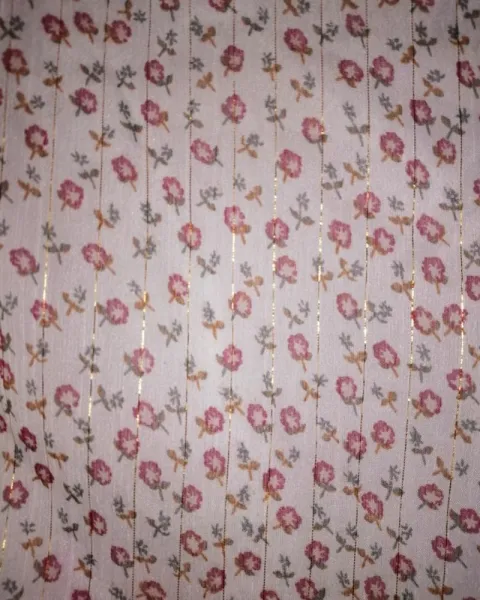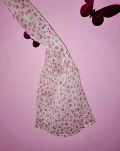 Hermoso y fresco vestido floreado en tonos rosas, pequeños y discretos tonos dorados. Hermosa Manga acampanada. Es talla extra chica pero viene amplio le va bien a una talla chica o mediana.