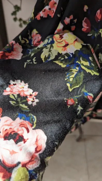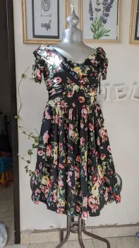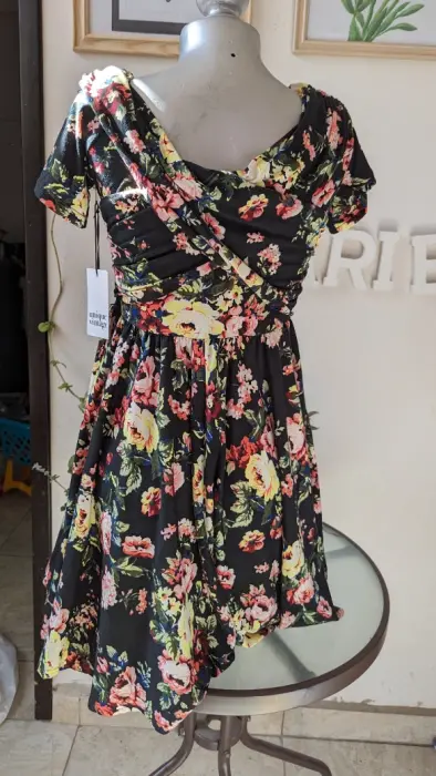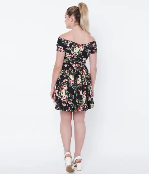 Vestido floreado. Vestido con hombros descubiertos, moderno pero de inspiración vintage, confeccionado en una suave mezcla de punto elástico. ¡Las mangas cortas mantienen muy bien el hombro descubierto! Falda fruncida con bolsillos y corte por encima de la rodilla. El amarillo de las rosas domina el patrón, que es encantador.