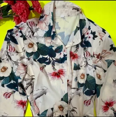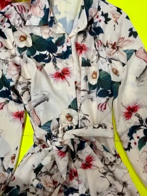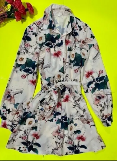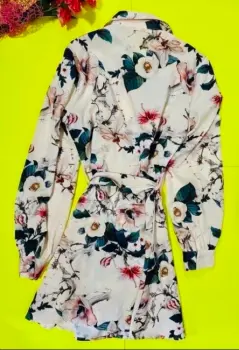 Vestido floreado marca Shein, talla chica, una sola puesta, tela viscosa y algodón. Muy cómodo, diseño de tela muy lindo. Lo puedes usar como vestido o blusón. Sin detalles