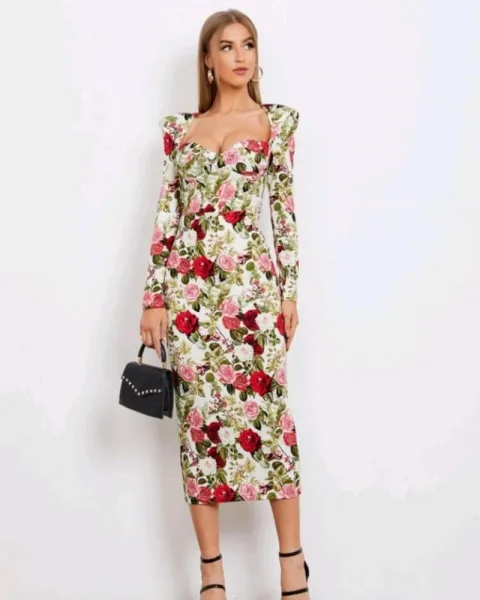 Vestido con estampado floral, con hombreras, casi llega al tobillo
