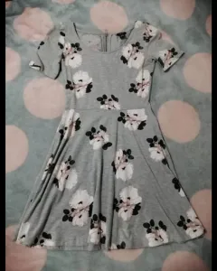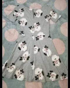 Vestido floreado color gris con rosa, con manga corta, tela de algodón, se ve muy lindo puesto