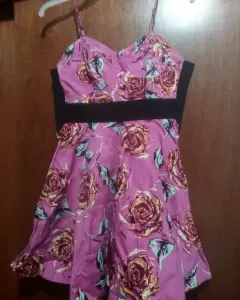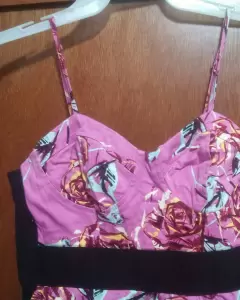 Es un vestido floreado muy bonito para esta temporada de calor y tiene un faldón rosa de buena calidad que no transparentea nada.Medida de largo de vestido 58cm, tomando como referencia donde empiezan las copas hasta el tiro completo de vestido.Se encuentra en perfecto estado,