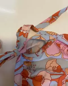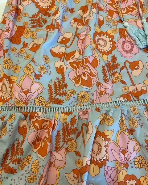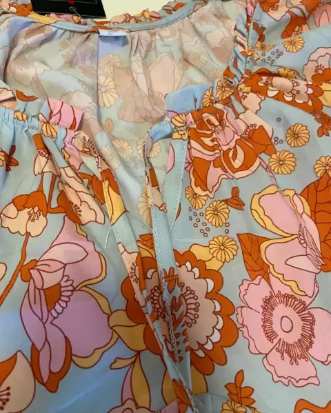 Vestido con print flores, cuello en V, tiene listones en mangas para hacer moño, es flojito, muy casual.