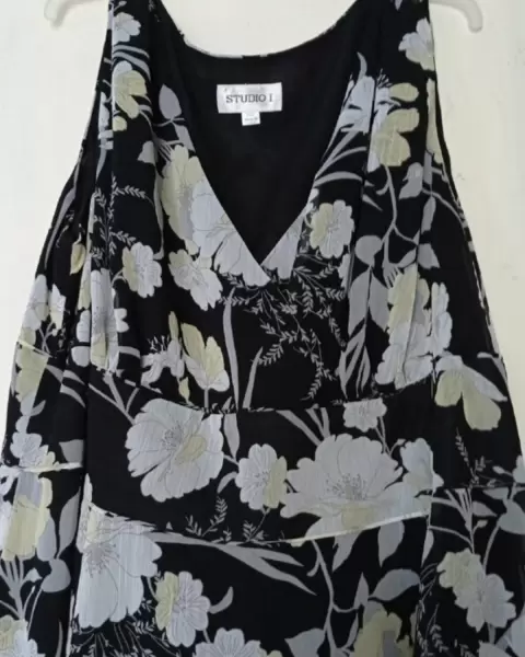 Vestido floreado. Vestido negro con flores amarillas en tono pastel. Tela ligera.