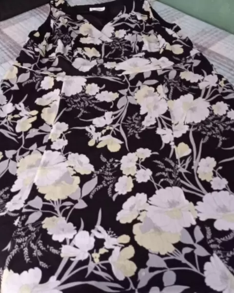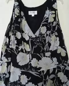 Vestido negro con flores amarillas en tono pastel. Tela ligera.