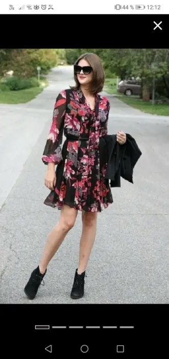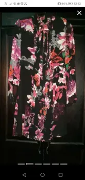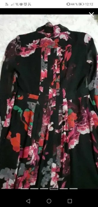 Vestido negro con motivos florales, principalmente en rosa y rojo, con un corbatin (liston) unido al cuello que podras atar con un moño. Manga larga, terminada en elástico. Y detalles plisados (con dobleces) al frente y en la parte de atrás.Medidas aproximadas94 cm de largo desde el hombro36 cm cintura44 cm de axila a axilaCierre en un costado.